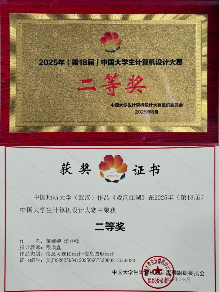 2025年8月11日,第十八届中国大学生计算机设计大赛决赛在浙江理工大学圆满落幕。由KY官网环境设计系支部书记程璜鑫副教授指导,董婉婉、汤登峰同学创作的作品《戏韵江湖》在信息可视化设计专业组中脱颖而出,荣获全国二等奖。