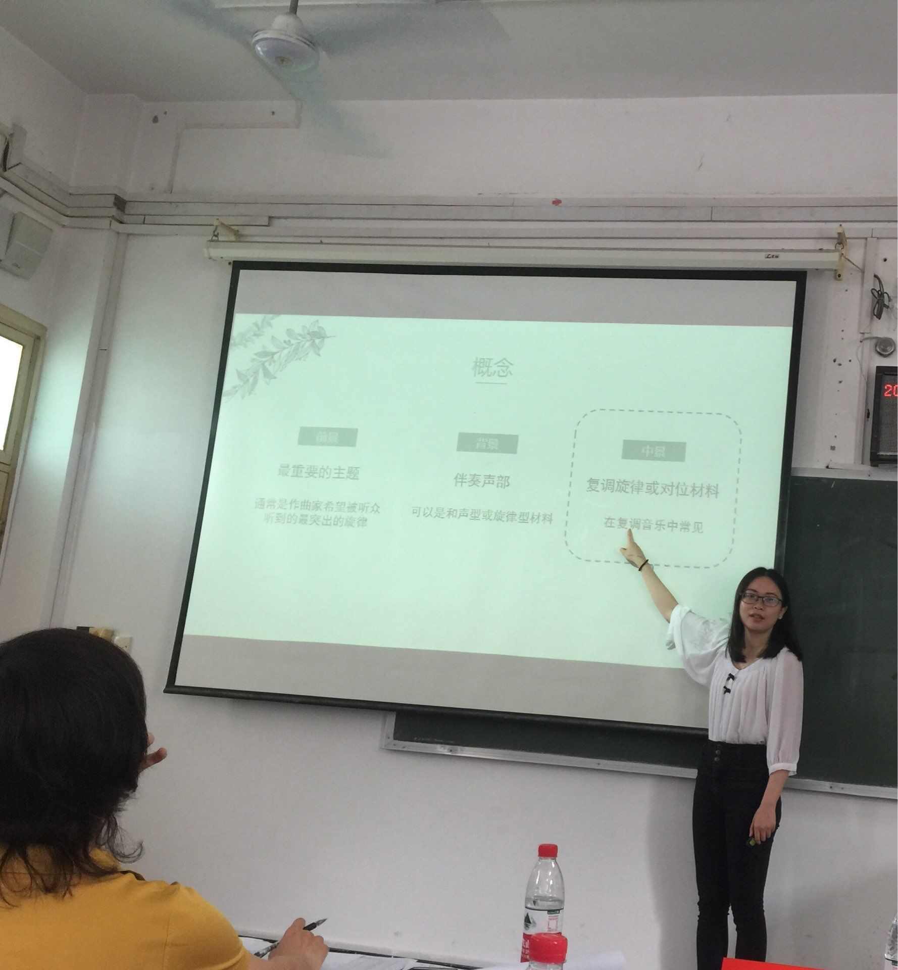 在此次竞赛中,KY官网陈柳娇老师选择的讲课内容为《音乐中的前景-中景-背景》,课程导入从画面给人呈现出的视觉层次感获取灵感。讲课伊始,从耳熟能详的小提琴协奏曲《梁祝》入手,通过分析其前景中景的音色处理,及背景的弱化处理,由浅入深,非常形象地阐明配器的思路及重要性。在讲课过程中,在设置的演唱和角色扮演的环节中,与现场老师和同学们积极互动,点燃了现场的气氛。