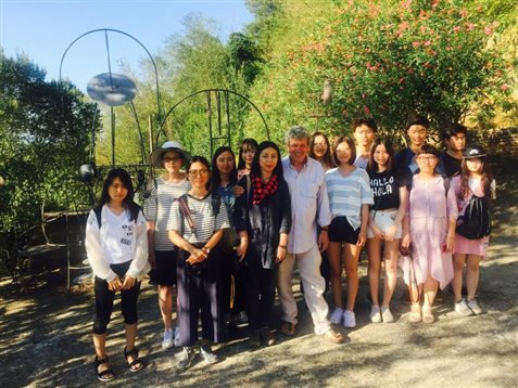 午后,同学们跟随老师来到了著名艺术大师托马索的工作室。一进门,托马索便主动热情的和大家握手问好,并为大家介绍他的作品。大师出生于一个艺术世家,他的家人大都走向了艺术这条路,而他本人在当代艺术中开辟了一片天地。工作室里干净整洁,作品井然有序。往下走两层,摆放了很多用不同材质如铜板、画布、铁等通过不同方法创作的作品,其流畅的线条与漂亮的色彩令实习小组惊叹连连。托马索大师在工作室的后院向大家分享了一些自己对于艺术创作的感想,并表示将来到地大为大家教授铜板画课程。在与大家合影后,他赠送自己的画册给每一位同学和带队老师,并签名涂鸦,给同学们一个大惊喜。