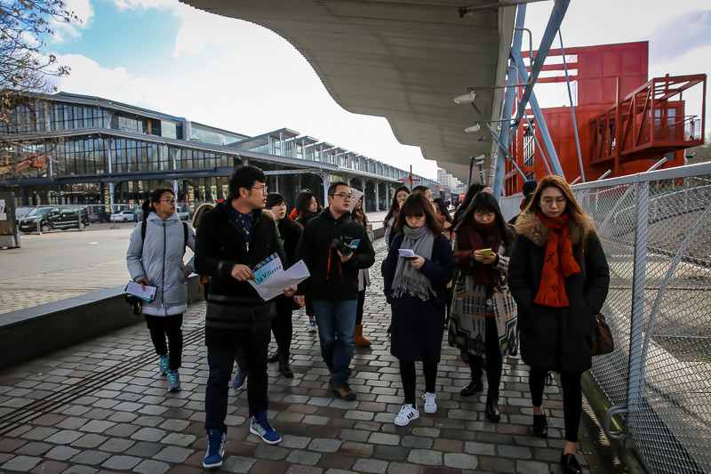 上午10点30分,访学团到达拉维莱特公园,并在程璜鑫老师的带领下进入公园内部进行参观。在正式进入公园之前,程璜鑫老师向访学团成员介绍道:“拉维莱特公园是解构主义的代表之作。解构主义,简单来说就是采用解析的方法,将传统结构分解成一系列要素并重新组合,组合的原则却不再遵循传统的均衡与稳定,而是更加强调因地制宜和随机性。拉维莱特公园所在地其最开始是一个旧的工业用地,1867年改建成为牲畜屠宰场,1973年屠宰场关闭后,时任法国总统德斯坦提议兴建一座大型的科技、文化设施。1982年,密特朗总统提议举办了拉维莱特公园的国际设计竞赛。就是在这次竞赛中,具有法国和瑞士双重国籍的建筑师伯纳德·屈米(Bernard Tschumi) 最终胜出成为公园的总体设计师。此公园还被列为纪念法国大革命二百周年而在巴黎兴建的九大“总统工程”之一。”