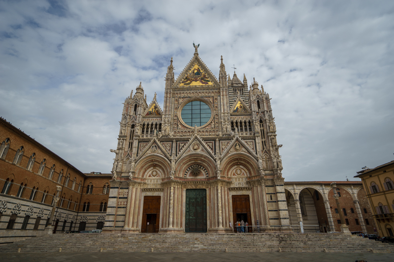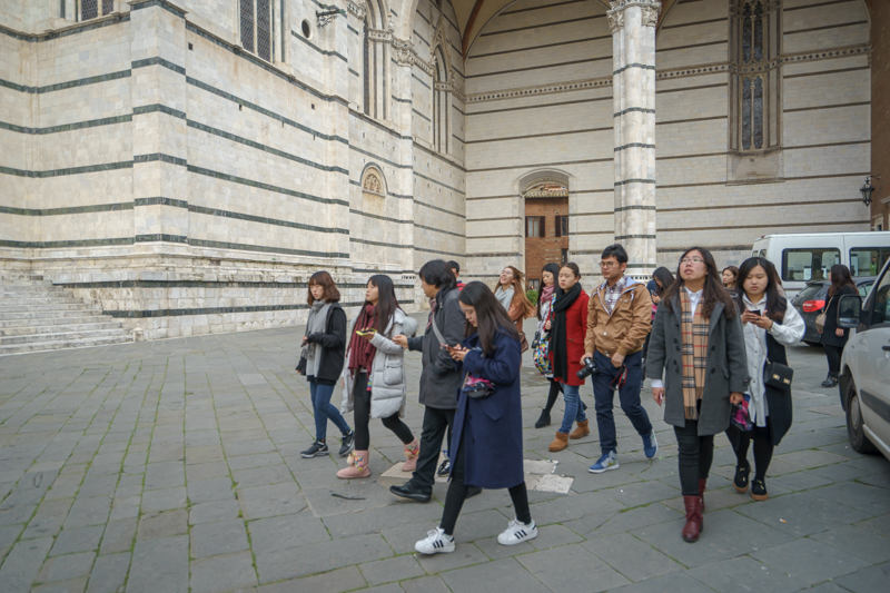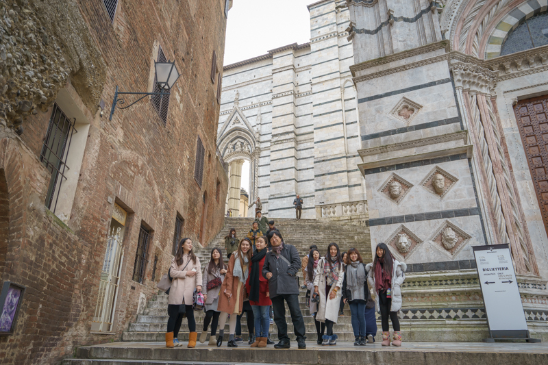 午时11点15分,访学团一行经锡耶纳卡加纳音乐学院,前往锡耶纳大教堂进行参观。穿行在锡耶纳的街巷,马林老师向访学团介绍了锡耶纳大教堂的历史。他表示:“锡耶纳大教堂时意大利最大的教堂之一,是始建于1136年的哥特式建筑。教堂内藏有诸多珍宝,而尼古拉·皮萨诺及米开朗基罗的雕塑作品亦藏于其中。”语毕,访学团成员均对该教堂有了初步的了解。行至锡耶纳大教堂的门前,马林老师便携访学团成员在此一同观赏教堂的外部构造,并邀访学团在此合影留念。