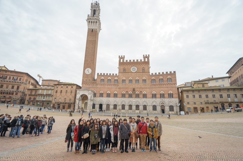 午时11点整,访学团一行抵达坎波广场。据马林老师介绍,坎波广场整体呈贝壳型,而其正中是锡耶纳曾经的大公府。此外,该广场还是世界文化遗产重点保护对象,更有“全世界最美广场”的美称。