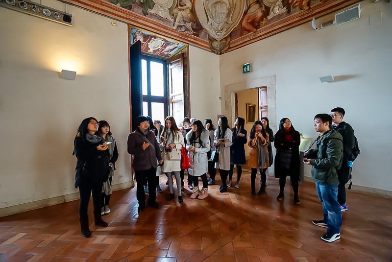 埃斯特庄园又名千泉宫,坐落在罗马以东40公里处的蒂沃利(Tivoli)小镇上。蒂沃利是罗马著名的风景区,海拔140米,坐落在亚平宁山脉脚下,从蒂沃利小镇可以俯瞰整个罗马城。马老师为访学团讲授了府邸内精美的壁画及别墅的建造历史及手法。府邸内每个房间的天花板上,有大量罗马不同时期的壁画,马老师介绍到罗马人怀着虔诚并敬畏的心情,以修旧如故的手法至今不断对其进行修复和完善。此外,埃斯特庄园作为意大利台地园的典范,与兰特庄园(Villa Lant )、法尔耐斯庄园(VillaFarnese)并称为文艺复兴三大名园,2001年联合国教科文组织将其列入“世界遗产名录”。在马老师的带领下,访学团参观了园内最负盛名的多座喷泉,包括艺术大师贝尔尼尼设计的“圣杯喷泉”、庄园主设计师利戈里奥的作品“管风琴喷泉”、“椭圆形喷泉”、“龙泉”以及“猫头鹰与小鸟喷泉”等等。喷泉与雕塑、洞穴、音乐、鸟雀啼鸣相结合,设计巧妙,与自然景观水乳交融。同学们惊叹于庄园美不胜收的景观,并赞誉其不负“千泉宫”的美誉。