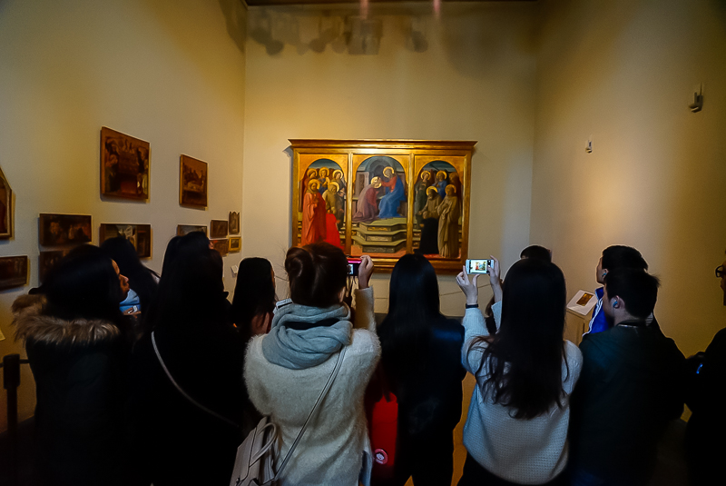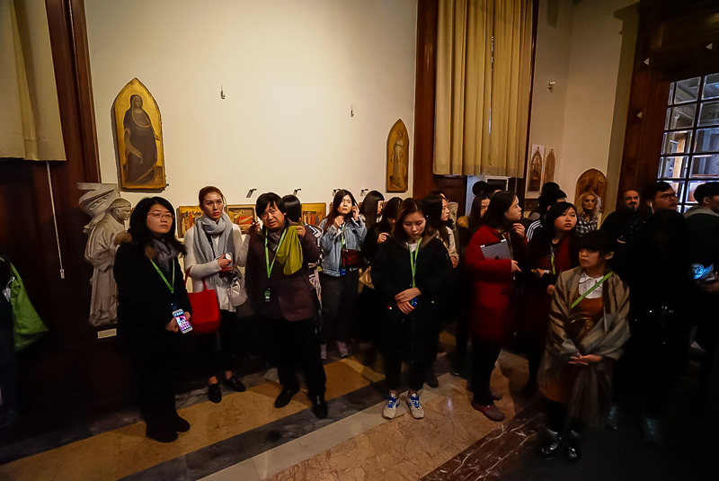 马林老师首先针对博物馆的油画作品,从绘画艺术的宗教、文化、风格等多个方面为访学团进行讲解。在谈到拉斐尔时,他认为:“拉斐尔的作品《耶稣显灵》较能体现拜占庭到文艺复兴时期的空间维度变化,虚实关系的转变,从缺乏人性没有动态到后面的充满人文情怀,其在西方艺术史上亦占有重要地位”。此后,欧洲访学团又参观了波提切利、提香、达芬奇以及贝里尼等名师的作品,在马林老师的讲解下,对博物馆内的油画作品有了进一步的了解。