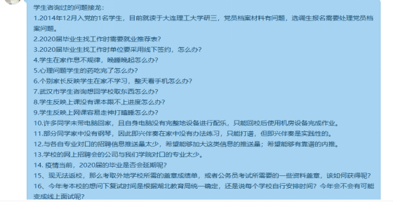 整合网络学习资源,解决学生学习痛点。学院学工组根据实际情况实施年级学生早起在线打卡制度,定期收集学生课程作业、线上学习问题、线上学习支持等信息,加强与学院教务办公室的协作,将各专业学生反应的50余个问题和需要的支持反馈给学院和相关老师,逐一销号解决落实;召开在线院领导接待日,141名学生在线与老师点对点交流,解决学习中遇到的困难;各专业举办线上学习交流分享会,交流学习方法,共享在线学习资源。