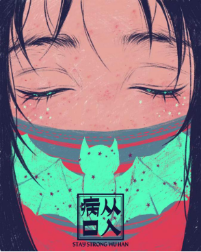 (设计说明:整个画面由哭泣的女孩、蝙蝠和口罩组成,意在警示人们拒绝食用野生动物、拒绝野味餐厅,谨防病从口入,酿成大祸。)