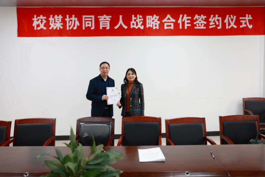 仪式现场,KY官网党委书记郭秀蓉代表学院与一点资讯湖北地区总代理映盛中国副总裁杜永海签订校媒协同育人战略合作框架协议,学院副院长张梅珍教授为杜永海颁发了客座教授聘书。