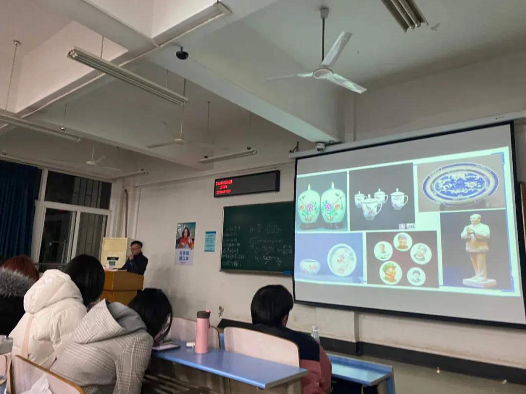 第三部分,龚老师着重讲解了景德镇制瓷的工艺美术史。他用优美的图文,生动形象地展示了从东汉时期直到现代,景德镇陶瓷在工艺和技法上的各种突破。期间,龚老师还重点介绍了青花瓷等等内容。接下来,通过描述景德镇陶瓷艺术的现状,告诉同学们:“经历了半个世纪的历史,景德镇一直用科学发展观的全新理念,开拓新的征途,对我国陶瓷事业的发展做出了很大贡献。”