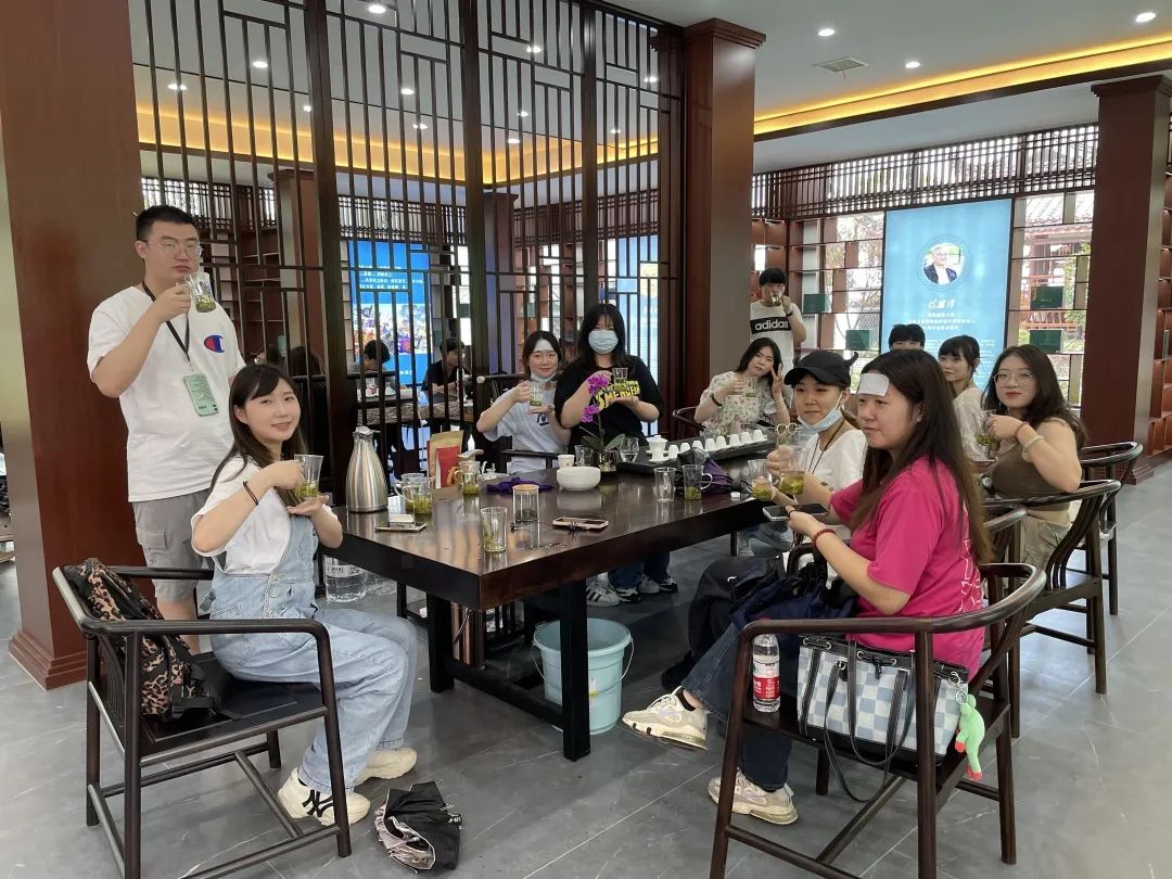 随后,孟老师带我们去山上的茶园参观。十几分钟的盘山公路窄小又曲折,几个180度的大转弯,让我们为司机师傅捏了一把汗,好在师傅的技术能轻松应对它们。惊险又刺激的车程结束,映入眼帘的是世外桃源般的茶园,园落漂亮又别致。我们一块参观并了解了制茶技艺,还有幸品尝到了著名的恩施玉露茶,茶汤嫩绿明亮、清香持久、鲜爽回甘。茶园外的风景也曼妙绝伦,乳峰胜景,晨云浮移,静谧的自然风光让人拜祭与向往,大家都禁不住拿起手机在这绝美的地方拍照记录,不愿离开。