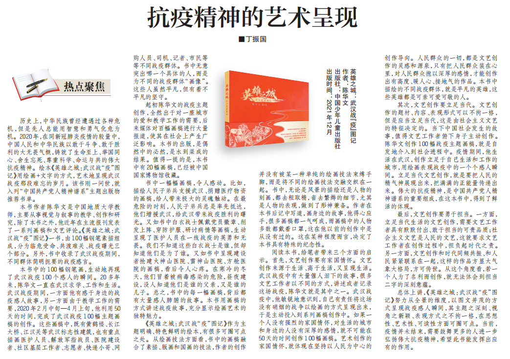 《英雄之城:武汉战“疫”图记》是目前国内唯一一本全景展现武汉战疫的绘本,2021年12月由中国少年儿童出版社出版发行,入列“中国共产党人精神谱系”主题出版物推荐书单。其中,绘本中的20幅原稿,2020年入藏中国国家博物馆。