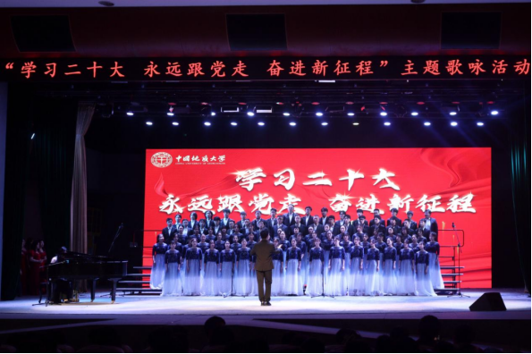 为贯彻落实学校主题教育实施方案当中“在‘重实践’上下功夫”的有关要求,深入学习党的二十大精神,营造团结奋斗、昂扬向上的精神面貌和学习氛围,进一步激发师生的爱国热情和使命担当,5月21日晚KY官网八十多名师生在弘毅堂参加了由学校举办的“学习二十大,永远跟党走,奋进新征程”主题歌咏比赛。