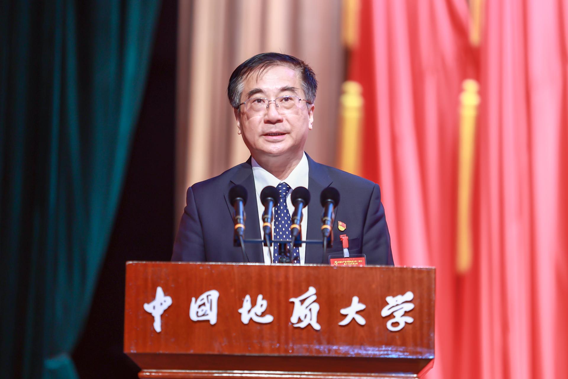 张幸平代表湖北省委教育工委、省教育厅党组致辞。他表示,中国地质大学(武汉)党委,自十二次党代会以来,各项事业蓬勃发展,取得令人瞩目成绩,同时深度融入地方发展,为湖北经济社会高质量发展提供有力的智力、人才和创新支撑。他希望,新一届领导班子坚持以党的建设统领学校各项工作,以高质量党建引领高质量发展,坚持以立德树人为根本任务,培养担当民族复兴重任的时代新人,坚持高质量创新发展,加快推进国际知名研究型大学建设,持续立足湖北、扎根湖北,积极对接地方重大战略、重大平台建设需要,助力湖北“建设全国构建新发展格局先行区”、武汉“打造全国科技创新高地”。