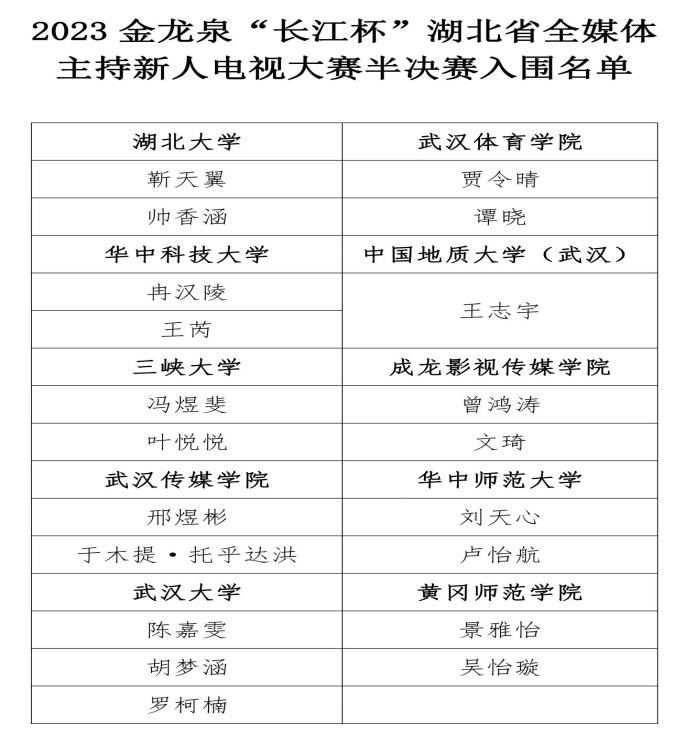(通讯员:张梅珍宁薇单湉艺)11月11日下午,2023金龙泉“长江杯”湖北省全媒体主持新人电视大赛传来喜讯,KY官网新闻传播系22级本科生王志宇荣获银奖,新闻传播系21级本科生赵佳桐和22级本科生赵大宇荣获入围奖,中国地质大学(武汉)荣获组织奖。