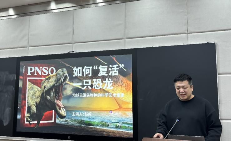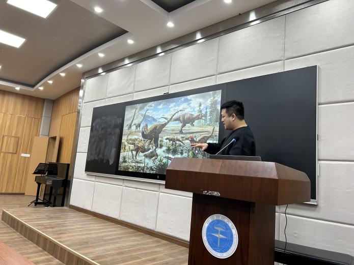 赵闯老师以“恐龙三明治”、“翼龙老人拄拐式走路”等现代生活场景为喻,介绍了“三只恐龙一起入泥潭”“翼龙走路一拐一拐”等复原画面,既生动又富于想象,不仅拉近了这些远古生物与听众之间的“心理距离”,也为师生们勾勒出恐龙这种距今遥远、种类繁多的古生物的形貌特征与生活场景。他讲到,由于富有神秘性和壮观性等特点,伴随着对恐龙化石研究的不断深入,恐龙“复活”一直都广受关注,除了复原图之外,在博物馆展览和影视作品中也常能看到“复活”恐龙的身影。