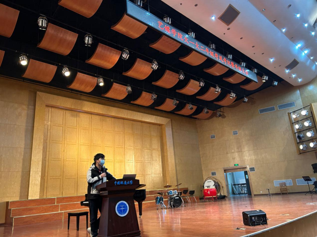 大会第三项,学工组辅导员曾戈晖首先介绍了2022级本科生的基本情况,其次对学风建设、安全教育、日常管理等问题做强调,最后从成果积累、未来规划、学生问题及应对方式入手进行了学期总结。