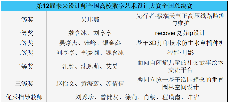 11月16日,第12届未来设计教育论坛暨未来设计师·全国高校数字艺术设计大赛(NCDA)落幕,KY开元集团官网师生凭借创意与设计实力,斩获十余项奖项。其中,学生作品荣获一等奖2项,二等奖3项,三等奖1项;同时KY官网6位教师荣获优秀指导教师奖。