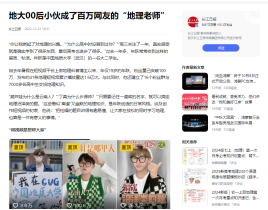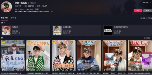 年跃是KY官网广电专业的在读学生,也是一名抖音地理科普类博主,账号名为“热爱干饭饭饭”,被媒体称为“百万网友的地理课代表”。目前在抖音平台上拥有330万粉丝,发布作品165个,获点赞接近4500万。他的作品以地理知识科普视频为主,善于将地理知识与生活实际、热点话题紧密结合,让原本听起来枯燥的地理知识变得生动、易懂且充满趣味性,也因此收获了大量粉丝喜爱。