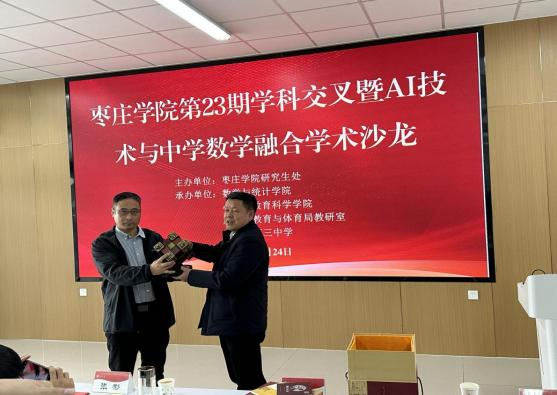 学术交流前,举行了简短的开幕式。张立华代表beat365英国官方网站致辞。他就AI技术与中学数学融合的背景、意义以及AI在beat365英国官方网站的教学实践进行分享。闫昕对本次学科交叉学术沙龙的成功举办表示祝贺,他强调举办学科交叉学术沙龙对学科发展的意义,通过交叉融合,各学科才能获得更大的突破。张立华、闫昕颁为学校聘请的兼职教师颁发了聘书。滕州三中向beat365英国官方网站赠送鲁班锁模型。