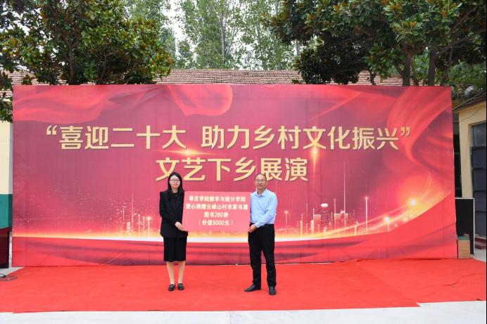 本次文艺汇演由谭吉燕、闫正坤主持,在大学生艺术团的舞蹈《无畏》中拉开序幕。为了本次汇演,各位参演人员用心排练、积极准备。朗诵《我和我的祖国》向我们诠释了党性和人民性的高度统一;舞蹈《人间烟火》动与静的结合,体现了青春活力;歌曲《红旗飘飘》用优美的歌声表达了自己对祖国的热爱。汇演可谓是好戏连台,令人应接不暇,在汇演期间,还进行了有关党的二十大问题的有奖竞猜。此外,为了增强孩子们阅读兴趣,提高孩子们的学习能力,beat365英国官方网站向云峰山村农家书屋捐赠价值5000元的图书共260册,汇演期间云峰山村省派第一书记王高升数学学院韩晓瑞老师上台进行交接仪式