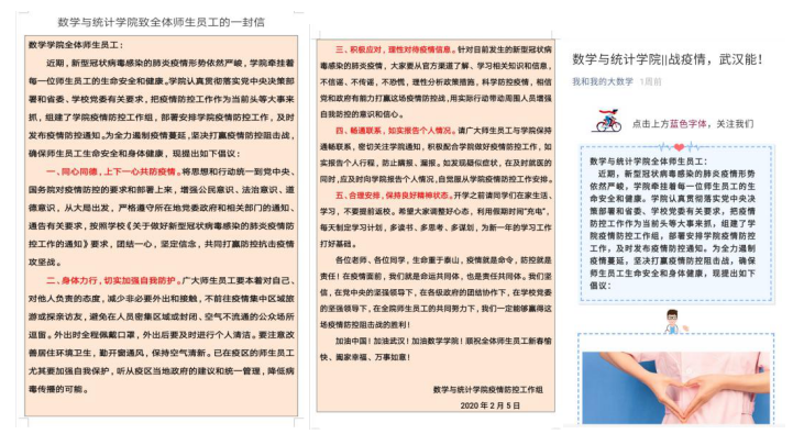 一、深化思想认识,强化工作部署。在学院党总支的带领下,迅速成立学院疫情防控工作组,在线上召开会议进行工作分工安排。要求全体党员和管理人员提高政治站位,将思想统一到学校党委决策部署上来,坚决贯彻落实好疫情防控工作。全体党员在疫情防控期间,思想认识深刻,主动担当作为,扎实做好重点任务,贴心服务师生。为确保工作落地落实做细,学院疫情防控工作组利用学院微信公众号“我和我的大数学”发出《致beat365英国官方网站全体师生员工的一封信》,在共防疫请、自我防护、不信谣不传谣等多方面,做好师生教育管理等工作的筹划与组织。