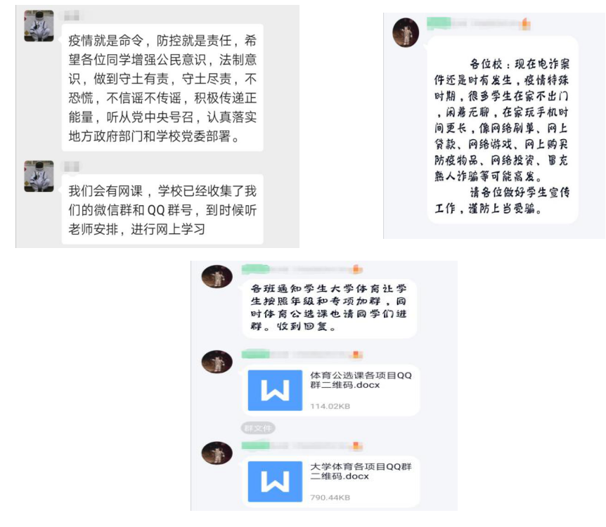 二、聚焦立德树人,抓好教育引导。党员和辅导员和班主任第一时间在班级群转发官方信息,再三嘱咐同学们认真关注、高度重视,同时提醒广大师生务必观看关注官方渠道的信息报道,正确认识新型冠状病毒的影响,避免引起恐慌,鼓励大家传递正能量。为充分发挥党员和学生干部的模范带头作用,采取“包产到户、责任分工”制,让每个党员承包1个班级,让每个班委固定对接本班几名同学,深入了解每个对接学生的信息和动态,确保能够在需要时第一时间联系到每一位同学。面对大一到大三的学生,引导学生“停课不停学”,在家制定学习计划,各班成立学习小组相互督促,不断充实和提升自我。面对大四的毕业生,积极在网上答疑解惑,开展就业指导、考研复试指导、线上求职辅导,及时发布各类就业信息和网上招聘信息。