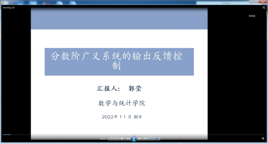 郭莹老师作了题为《分数阶广义系统的输出反馈控制》的学术报告。报告介绍了四个方面的内容:一、如何利用迭代LMI算法解决分数阶广义系统及不确定分数阶广义系统的静态输出反馈镇定问题;二、 介绍分数阶广义系统及分数阶系统的动态输出反馈控制问题;三、分数阶广义系统与分数阶系统动态输出反馈控制镇定的充分必要条件;四、多胞型不确定分数阶系统的鲁棒动态输出反馈控制,并给出相关结论。