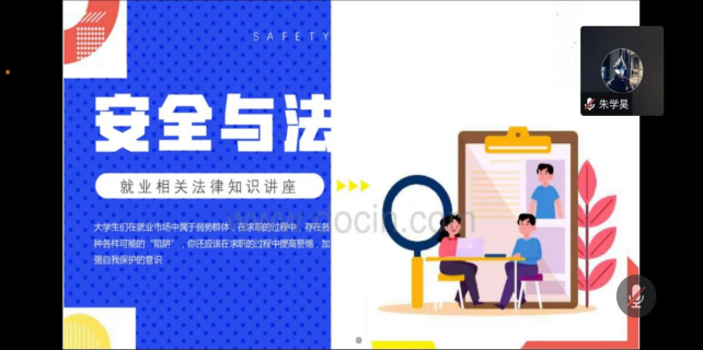 首先,老师通过线上提问引出大学生在就业中会遇到的安全问题,引导同学们了解就业安全法律知识。接下来,老师围绕甄别就业信息、参加就业面试、签订就业合同三个环节,介绍了各类就业陷阱的表现形式,让同学们警惕求职陷阱。然后,老师运用实际案例,结合详细数据分析,从人身安全、政治安全、就业安全、财产安全、预防传销等五个方面提出了就业安全应对策略。最后,老师通过常见的侵权行为介绍了公民的基本权益,自主择业权、知情权、违约求偿权等,提高了大学生防范就业安全事故的意识和实际应对能力。