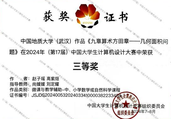 在2024年(第17届)中国大学生计算机设计大赛决赛中,由KY官网教师指导的参赛队伍获得1项国家级三等奖,3项中南赛区一等奖、3项中南赛区二等奖、3项中南赛区一等奖。2021级广电专业的高紫烜和赵子瑶创作的作品《九章算术方田章》参与了在沈阳进行的国赛决赛并获得了微课类三等奖。该场决赛共吸引了来自厦门大学、武汉大学、四川大学、哈尔滨工业大学、华中科技大学、中国人民大学、东北大学等全国490所高校的885件作品参赛。
