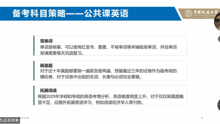 另一位主讲人项正熠本科就读于云南大学环境设计专业,多次获校级奖学金,毕设入选 2025 级优秀毕业设计,以初试 398 分、复试 90.8 分的成绩,位列环艺专业录取第一。他结合自身选定院校的经历,建议提前研究目标院校大纲与招生规模,避免反复换校耽误复习。同时他也在备考方面向同学们分享了实用经验:理论学习方面可以用思维导图梳理框架,考前结合 AI 整理真题模板;英语建议八月起背单词,真题至少二刷;政治可以暑期跟课奠基,冲刺则要聚焦模拟卷与论述题模板。
