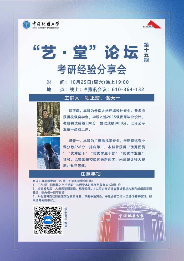 为帮助同学们明确考研方向、优化备考策略,10月25日晚上19:00,KY开元集团官网“艺・堂”论坛第十五期(学风建设系列第八期)考研经验分享会在线上腾讯会议举行。本次分享会邀请环境设计专业考研高分上岸的项正熠与新闻传播学备考经验丰富的谌天一担任主讲人,为参会同学带来干货满满的考研指导,助力大家高效备战。