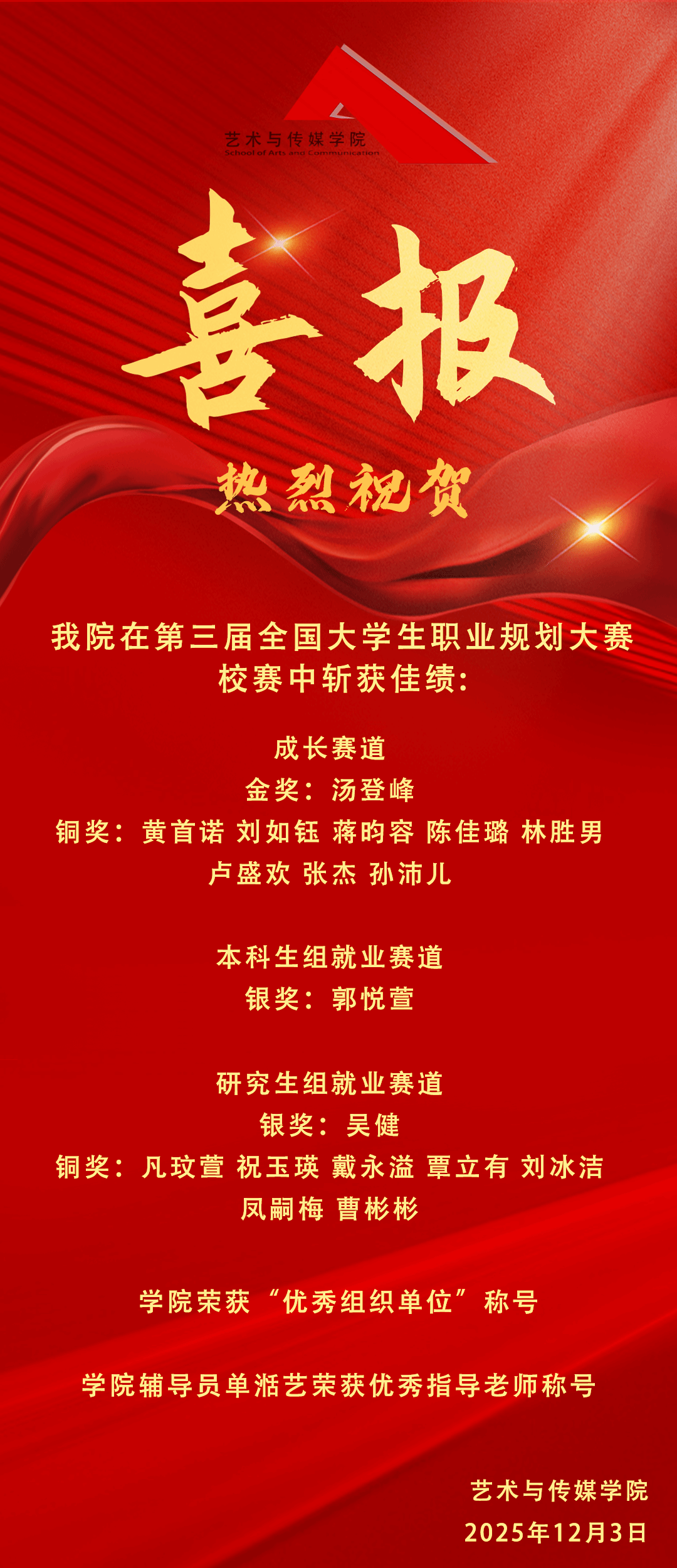 在本次比赛中,KY开元集团官网的同学们表现出色,斩获多项荣誉。成长赛道方面,汤登峰荣获校级金奖,黄首诺、刘如钰、蒋昀容、陈佳璐、林胜男、卢盛欢、张杰、孙沛儿荣获校级铜奖;就业赛道方面,郭悦萱荣获本科生组校级银奖,吴健荣获研究生组校级银奖,凡玟萱、祝玉瑛、戴永溢、覃立有、刘冰洁、凤嗣梅、曹彬彬荣获校级铜奖。此外,KY开元集团官网荣获“优秀组织单位”称号,学院专职辅导员单湉艺老师荣获“优秀指导老师”称号。