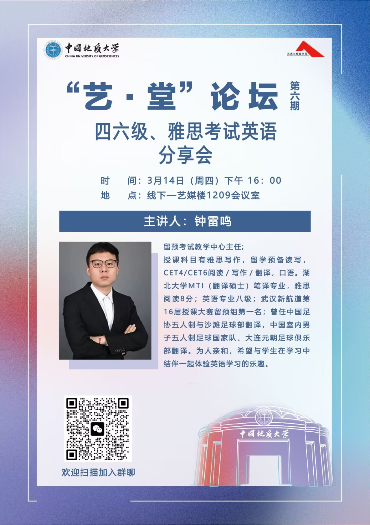 2024年3月14日下午16:00,“艺·堂”论坛第六期四六级、雅思考试英语分享会暨第七期“弘艺班”学生骨干培训于KY开元集团官网1209顺利举行。学院邀请了新航道武汉学校的钟老师为同学们进行四六级和雅思英语考试的教学指导。本次讲座由兼职辅导员廖文琦主持。