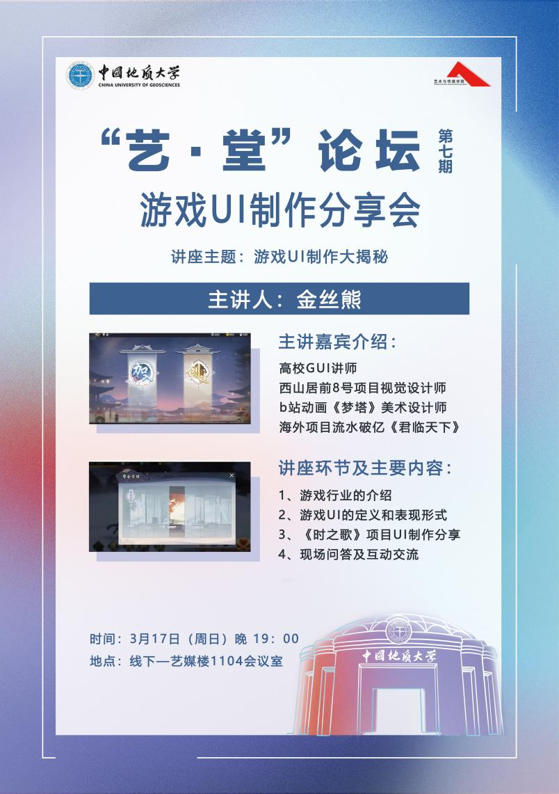 2024年3月17日晚上19:00,“艺·堂”论坛第七期游戏UI制作分享会于KY官网1104顺利举行。学院邀请了武汉YOCG艺术的金丝熊老师为同学们进行了有关游戏UI制作的经验分享。本次讲座由兼职辅导员于梦涵主持。