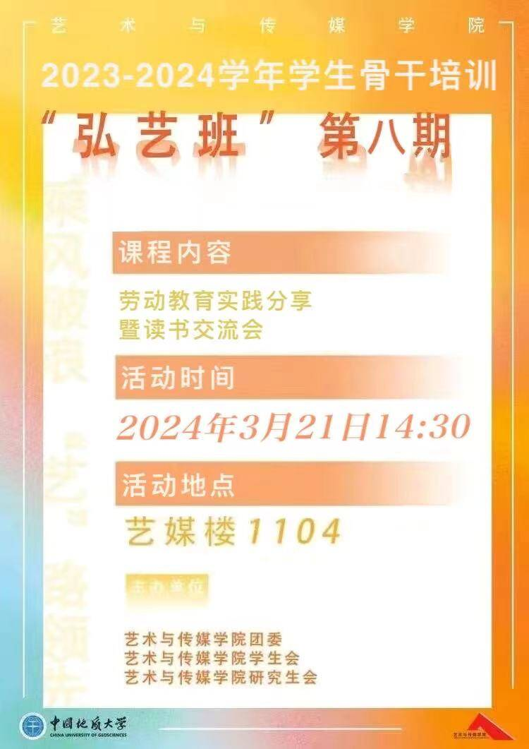 为进一步加强学生干部队伍建设,提高学生干部的综合能力,3月22日,KY开元集团官网学生第八期骨干培训“弘艺班”劳动教育实践分享与读书交流会在1104报告厅举行。KY开元集团官网学生会、研究生会全体学生骨干参加培训,团委副书记王琦主持。