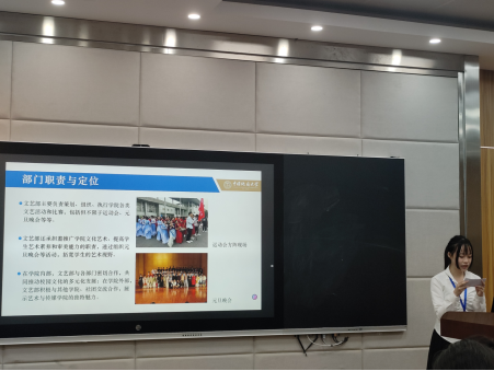 第七个答辩部门为文艺部。答辩人员在介绍了工作内容,成员组成和分工后,分享了部门成员的工作心得。今后,文艺部将加强团队内部的协作沟通,提升工作能力与效率,以美育工作为导向,进一步规划工作方向。