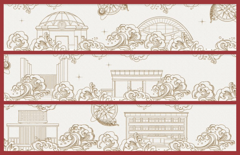 支部成员以卷轴、罗盘、校园建筑为基础的绘画作品