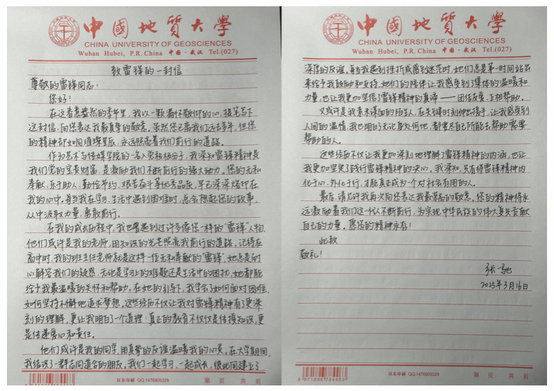 组织学生以手写信形式向雷锋同志表达敬意和感悟,通过文字抒发理想信念和精神追求。信件内容真实质朴、情感真挚,充分体现了青年学生对榜样力量的认同与传承。共征集作品26份,经筛选,共12份作品在地大艺媒党员之家平台集中展示。