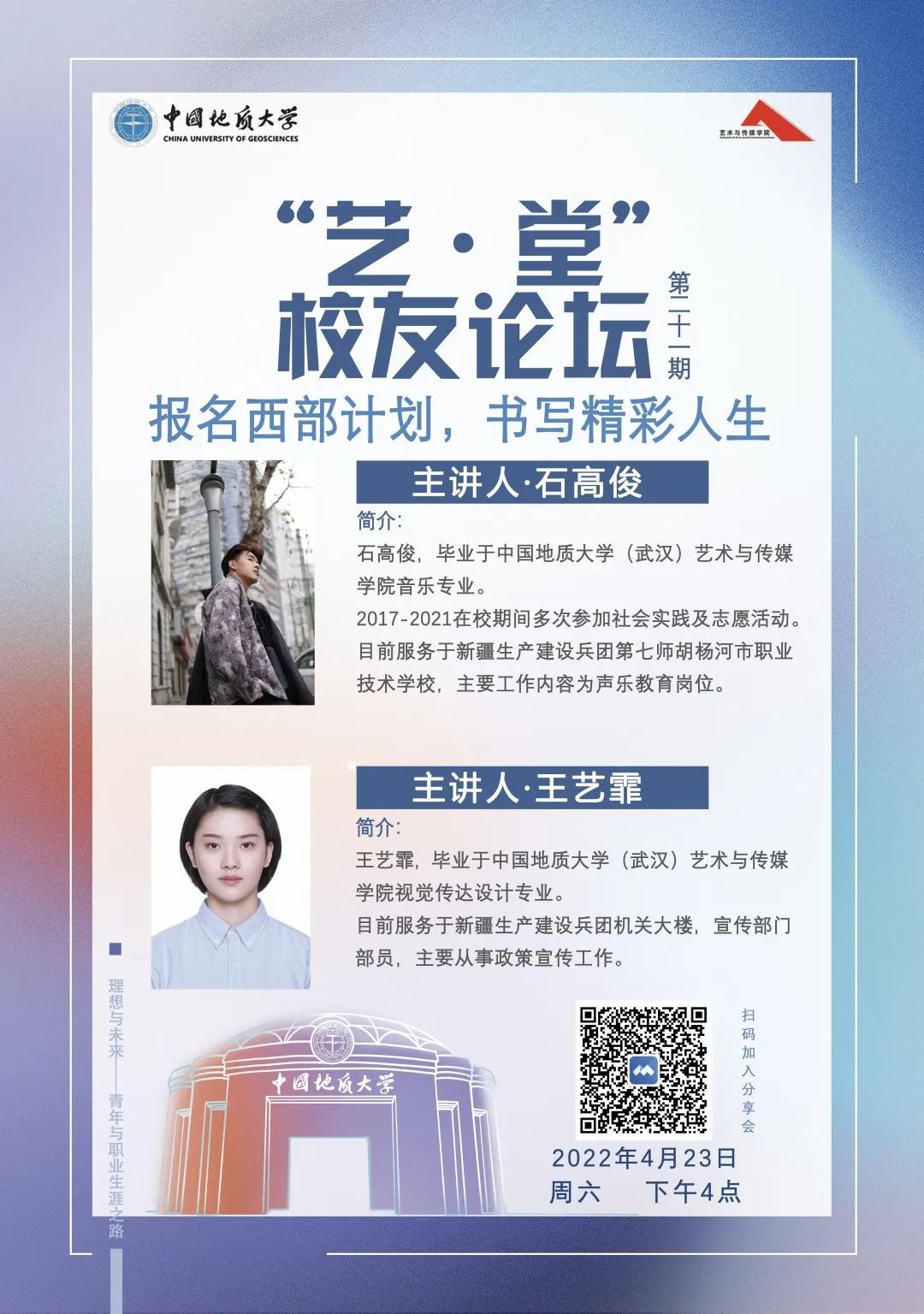 4月23日下午4:30,KY开元集团官网第二十一期“艺·堂”校友论坛“报名西部计划,书写精彩人生”讲座活动顺利进行,由KY官网音乐专业毕业生石高俊和视觉传达设计专业毕业生王艺霏主讲。