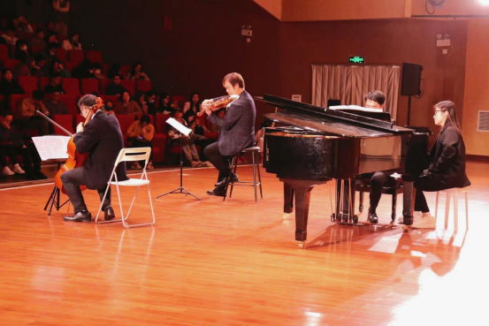 4月27日晚19:00,为提高全校师生美育素养,共享美育工作成果,“南望未来,艺熠星空--世界经典室内乐作品专场音乐会”在北区音乐厅隆重举行。中国地质大学(武汉校长王焰新院士、校党委书记黄晓玫教授等多位领导莅临音乐会现场。中国地质大学(武汉)KY开元集团官网教授、小提琴中提琴演奏家、圣彼得堡国立音乐学院博士、“地大学者”王凯平教授,联合湖南师范音乐学院教授、俄罗斯音乐艺术学科博士、青年大提琴演奏家陈果教授,以及湖南科技大学校聘副教授、俄罗斯圣彼得堡国立音乐学院钢琴独奏、室内乐演奏双博士、旅俄青年钢琴演奏家彭斯特副教授,一同向我们呈现了一场精彩绝伦的视听盛宴。整场音乐会持续一个半小时,分为上、下两场,分别演奏了《拉赫玛尼诺夫g小调钢琴三重奏》与《柴可夫斯基a小调钢琴三重奏》两首知名室内乐作品。