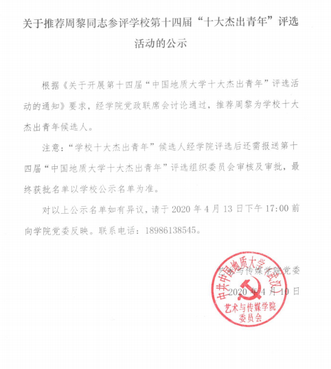 根据《关于开展第十四届“中国地质大学十大杰出青年”评选活动的通知》要求,经学院党政联席会讨论通过,推荐周黎为学校十大杰出青年候选人。
