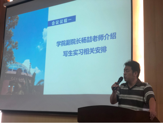 会议开始,大会第一项,由KY开元集团官网副院长杨喆老师介绍写生实习相关安排。他从实习安排、外出安全等多方面向同学们讲解了写生实习的内容。