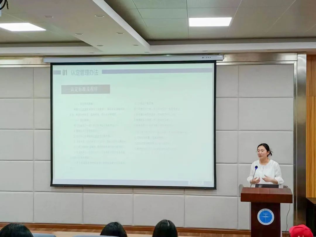 曾老师依次向同学们介绍了本次经济困难认定工作的操作流程、认定等级以及评议过程的注意事项等。在谈到班级民主评议工作环节时,曾老师着重强调了评议现场要保证有一名老师在场监督,并且要坚持按照公平公正公开、应助尽助和精准资助的原则展开民主评议工作,禁止出现“公开答辩”、“卖惨”诸如此类的不规范操作。此外,评议过程中可以采取个别交谈、电话访谈、信函索证、深入走访和数据分析等方式进行,要注意尊重和保护学生及其家庭的隐私。培训的最后曾老师列举了部分认定过程中常见问题的解决办法,如“家庭情况调查表需要盖章吗?”“系统无法登录怎么办?”,帮助到场的同学们更好地理解经济困难认定的程序和方法。