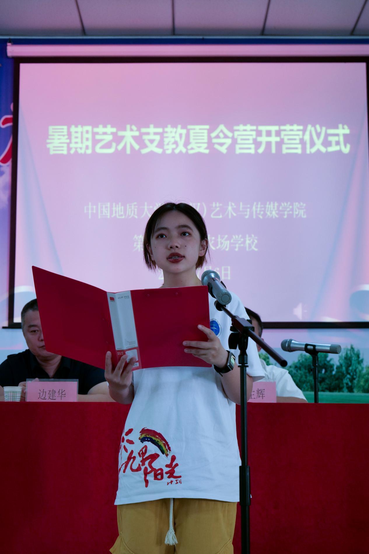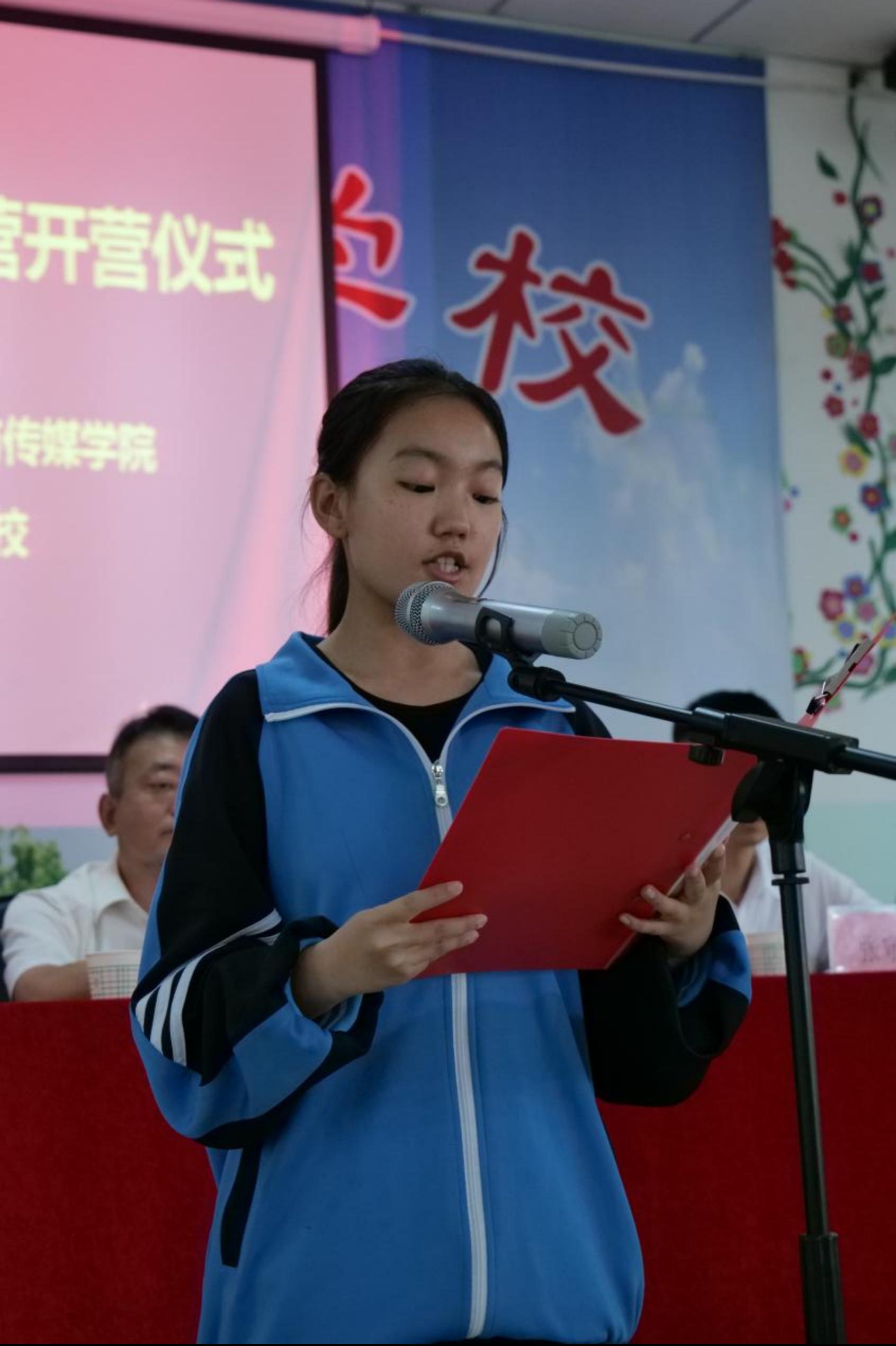 紧接着,红旗农场学校的杨嘉琪同学作为夏令营学员代表发言。在表达了感谢后,杨同学表示自己十分重视和珍惜参加此次夏令营的机会,相信通过为期一周的学习,一定可以在活动中收获满满,自己也将在今后的生活中用优异的成绩回报老师们的辛勤付出。