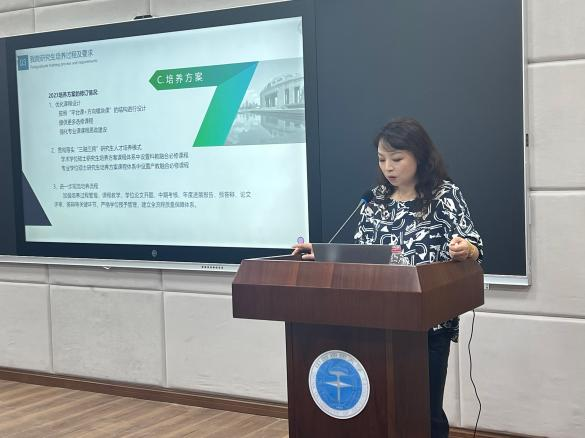 会议第二场,由副院长彭静和研究生教学秘书喻硕作研究生培养方案和研究生管理制度讲解、学风和学术道德教育。彭院长从学科建设、人才培养、学位管理、学术规范四个方面对研究生教育工作作系统讲解,并向同学们介绍了“三融三跨”的研究生培养新模式。在最后,彭院长寄语2023级新生要坚持热爱本专业、拓展眼界和格局,并不断锤炼自身品行,锐意进取,不负青春。
