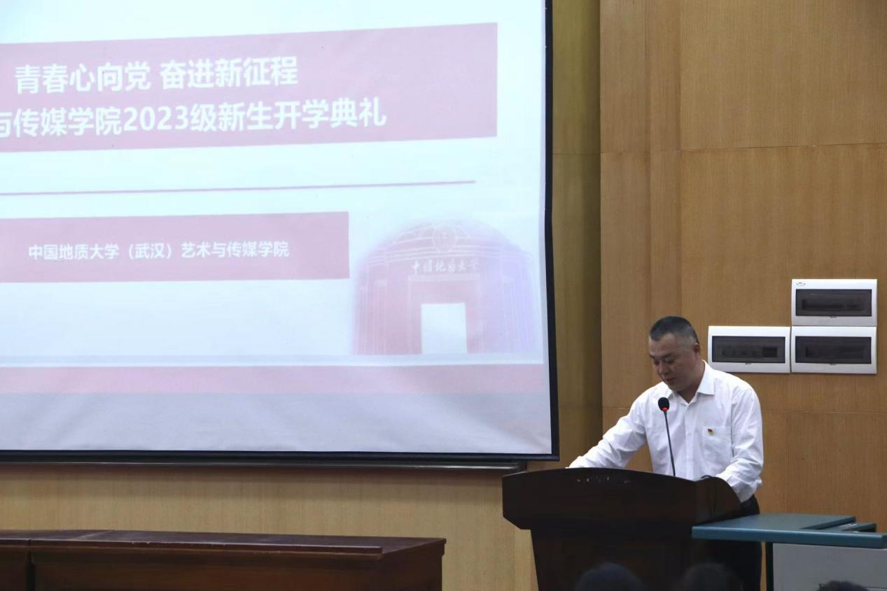 2023年10月8日下午14:30,中国地质大学(武汉)KY开元集团官网2023级新生开学典礼于西区教三楼109教室正式开始。学院党委书记晋曦,院长何清俊,副院长张梅珍、杨喆、袁玥、彭静,音乐系系主任周莉、党支部书记周黎,新闻传播系系主任宁薇、党支部书记尚媛媛,视觉与媒体设计系副主任徐莉,景观学系党支部书记程璜鑫、景观学系副主任程驰,学院办公室主任李伟娜,新生班主任王琦、曾珍、蔡爱新、郑丹丹,院直全体老师,以及全体2023级本研新生参加了此次开学典礼,活动由学院党委副书记边建华主持。