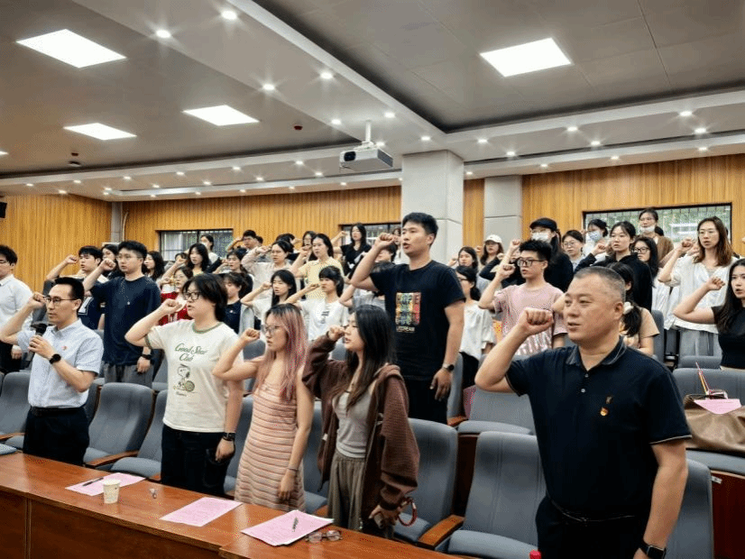 会议第一项,由学院党委书记冷再心带领毕业生党员重温入党誓词。