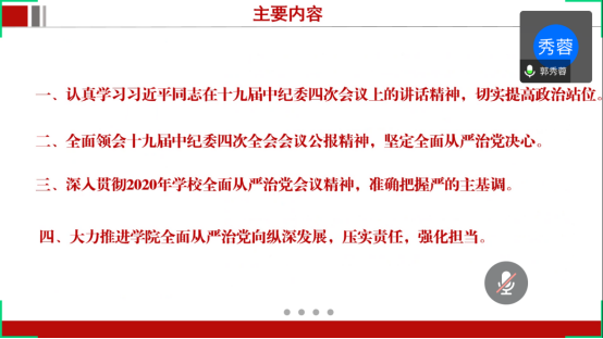 郭书记首先带领全体成员认真学习了习近平同志在十九届中纪委四次会议上发表的重要讲话精神和会议公报精神,接着传达了5月15日学校党委召开的全面从严治党工作会议精神,结合学院实际情况,从四个方面阐述了如何大力推进学院全面从严治党向纵深发展,要求全院党员干部进一步压实责任,强化担当。参会人员积极展开讨论,发表自己的学习感想和对学院全面从严治党工作的认识。