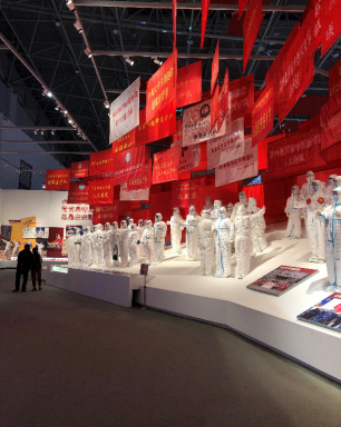 图二:重现援鄂医疗队签名队旗和防护服震撼人心